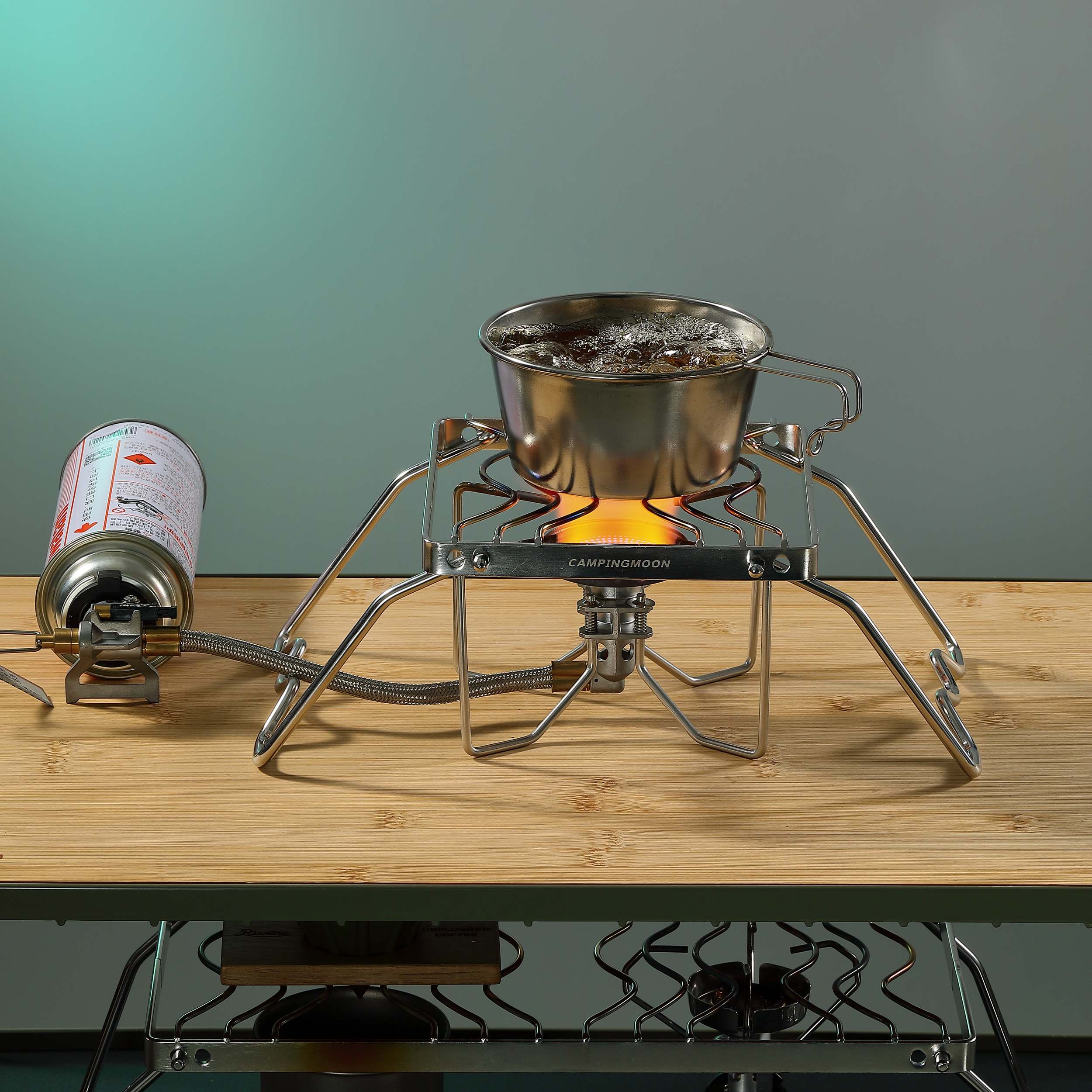 分離式シングルバーナーの上に設置することで、重いクッカーも安定して加熱できます。バーナー単体では不安定になりがちな調理も、このスタンドがあれば安心です。