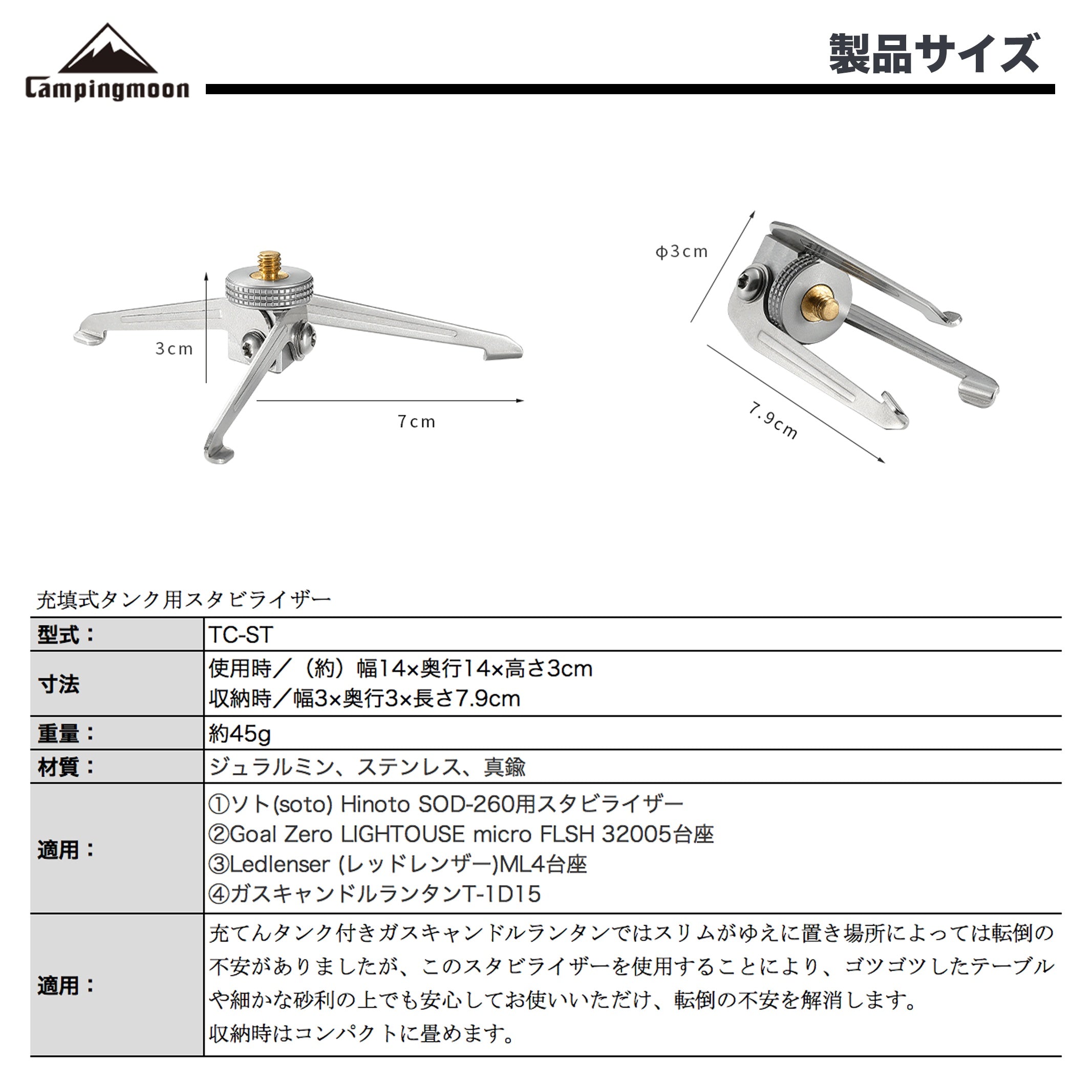 収納時はスリムですが、展開すると直径約14cmの広さになります。重心が高いランタンでもしっかりと支え、安心して使用できる土台を提供します。