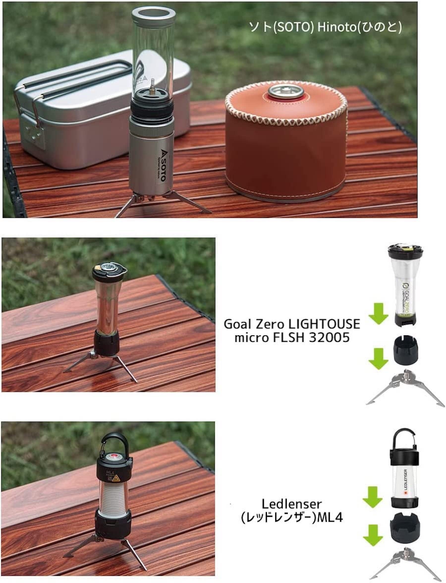 カメラ用三脚と同じ1/4インチネジを採用。SOTO HinotoやGoal Zero、Ledlenser ML4などの台座として、またミニカメラの雲台としても活用できます。