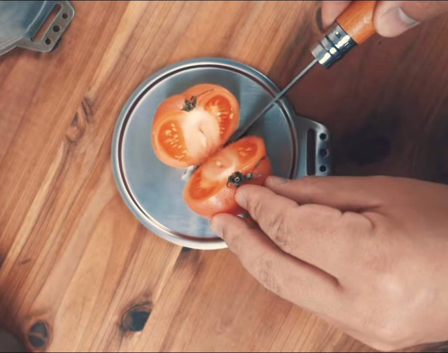 平らな形状を利用して、カッティングボードとして活用できます。ソロキャンプなどで荷物を減らしたい時に、食材を少し切り分けるのに十分なスペースを提供します。