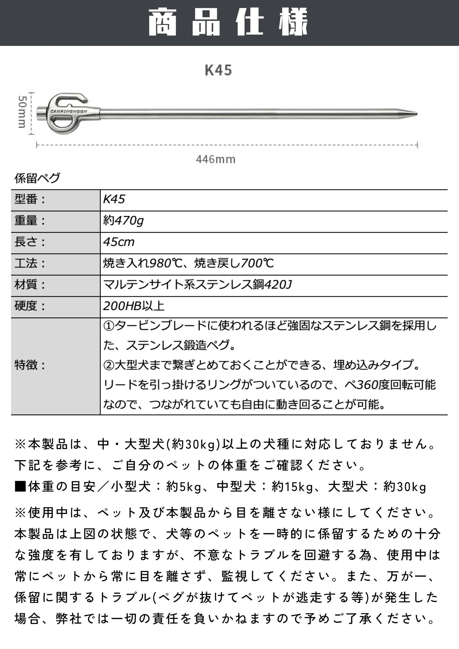 係留用ステンレスペグ 大型犬対応 K45