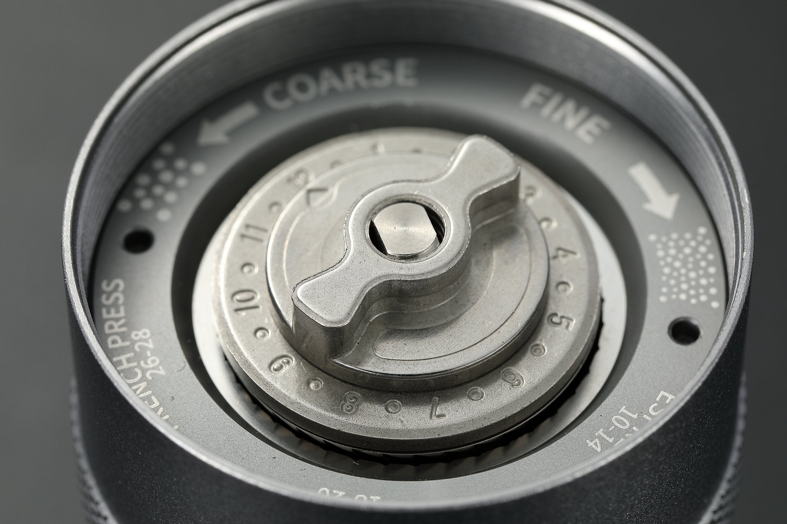 底面の調整ダイヤルで粒度を直感的に切り替え可能。中央のレバーと周囲の指標で、狙いの粗さに合わせやすくなっています。