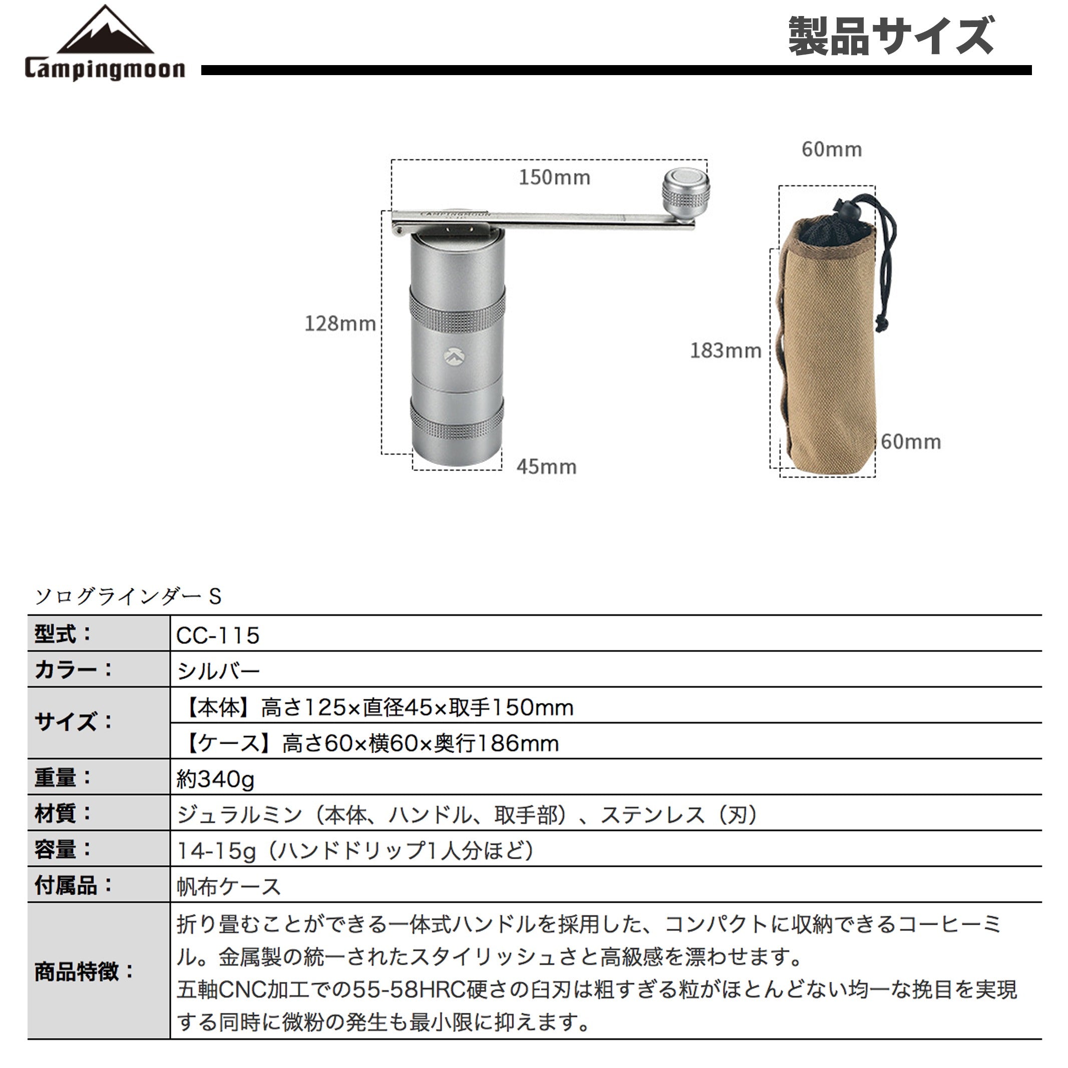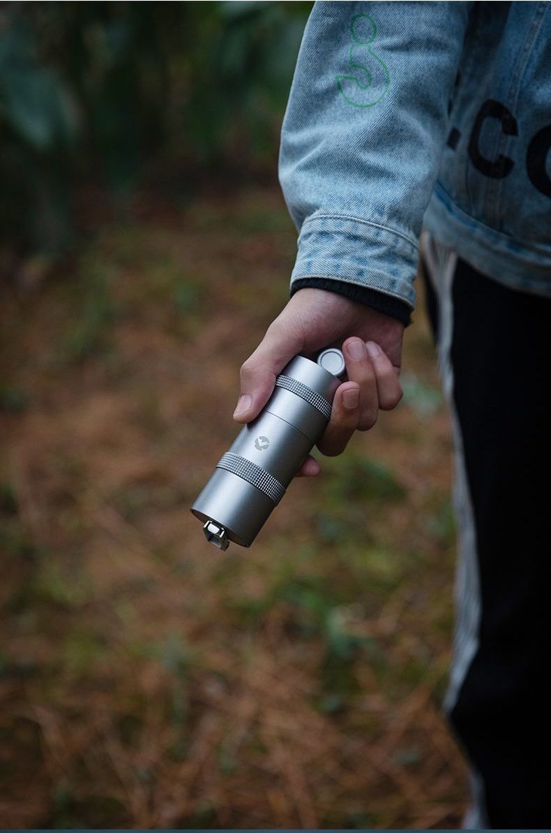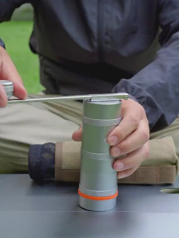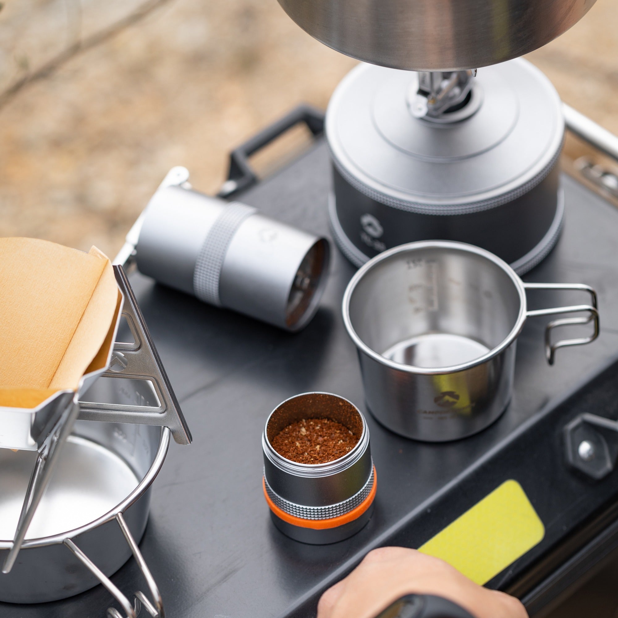 コーヒーセットと調和する金属ボディ。屋外でも扱いやすい操作感で、キャンプのコーヒータイムに自然に溶け込みます。